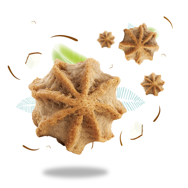 Ingredienti: Farina di grano saraceno*, zucchero di canna*, olio di girasole*, cocco grattugiato*, amido di tapioca*, fecola di patate*, inulina*, agenti lievitanti: carbonati di ammonio, carbonati di sodio, tartrati di potassio; antiossidante: estratti di rosmarino*; addensante: gomma di guar; sale.